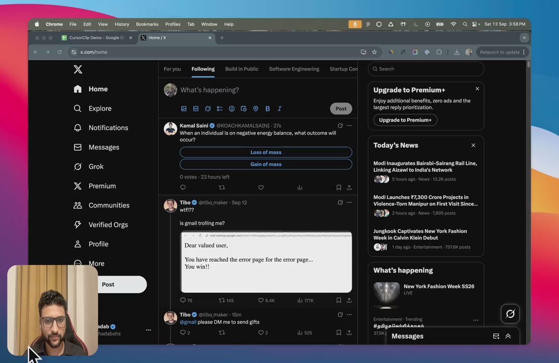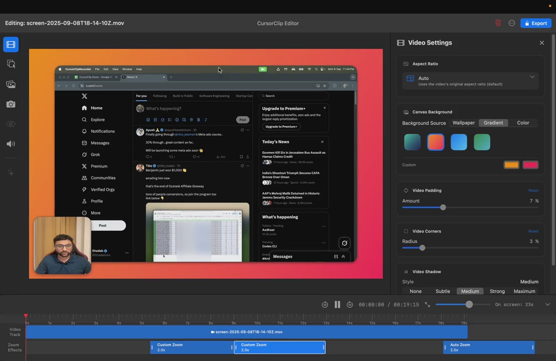 Capture your screen, system audio, and microphone in one go. Turn on your webcam if you want picture-in-picture for a more personal, “over-the-shoulder” feel. While you present, CursorClip’s smart tracking quietly follows your cursor and prepares the zooms and pans in the background. -