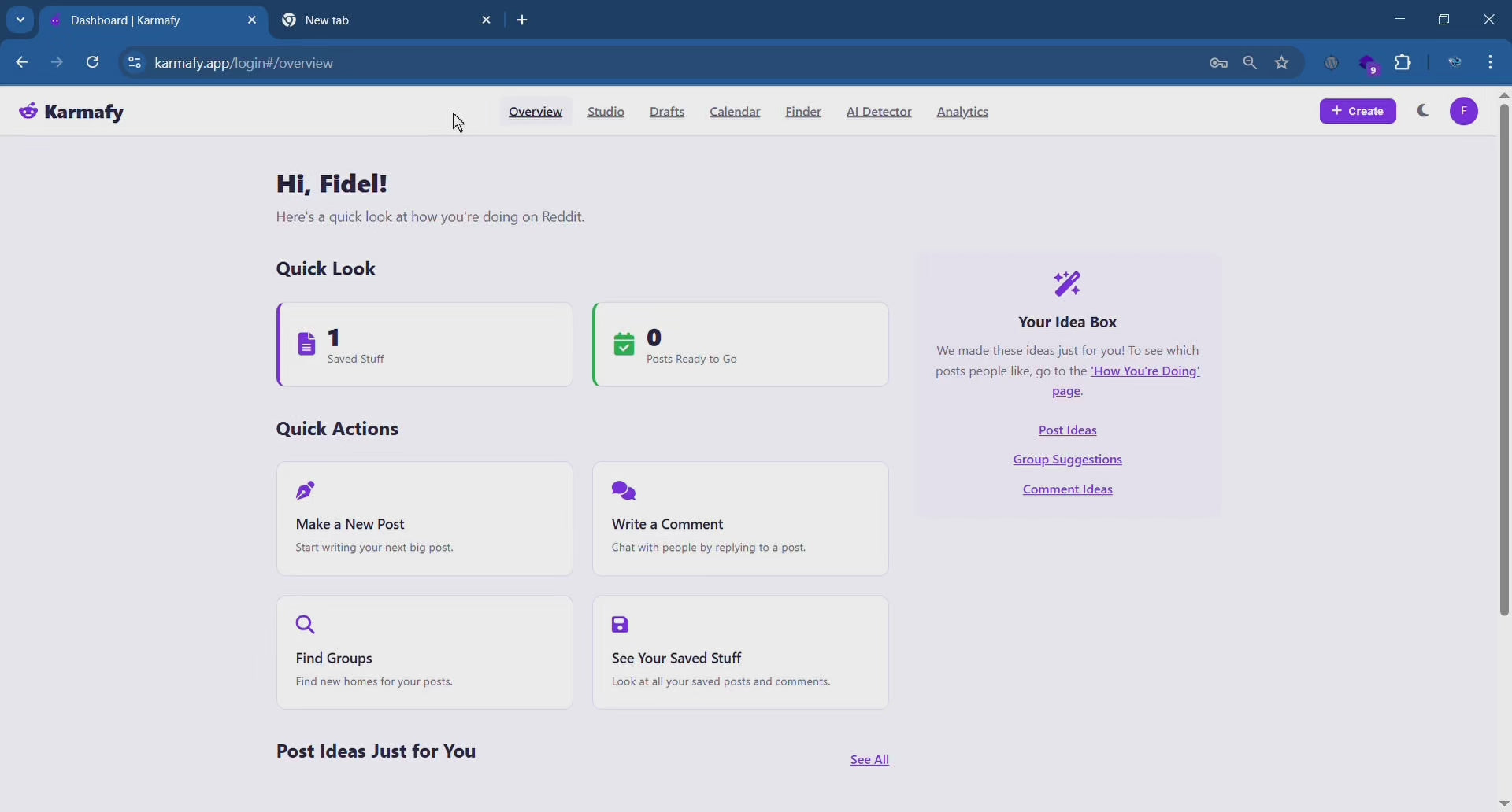 Karmafy is a helper tool for Reddit. It helps you get ideas for posts, write things that sound cool, find fun groups, and see how you're doing.